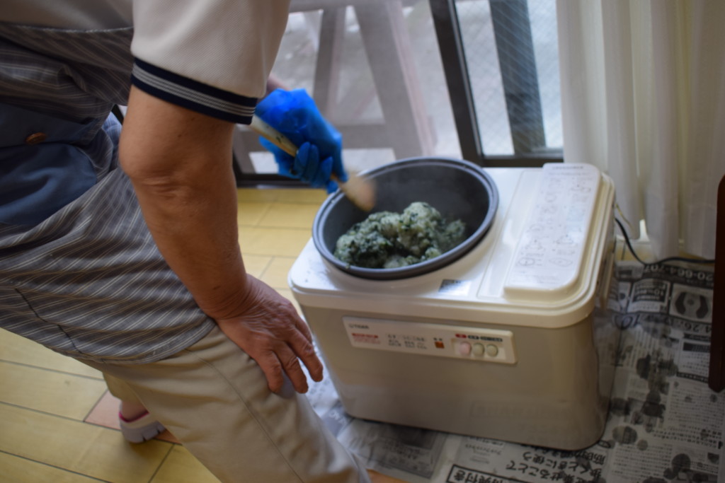きれいに下処理した「よもぎ」を混ぜ込んでいきます。