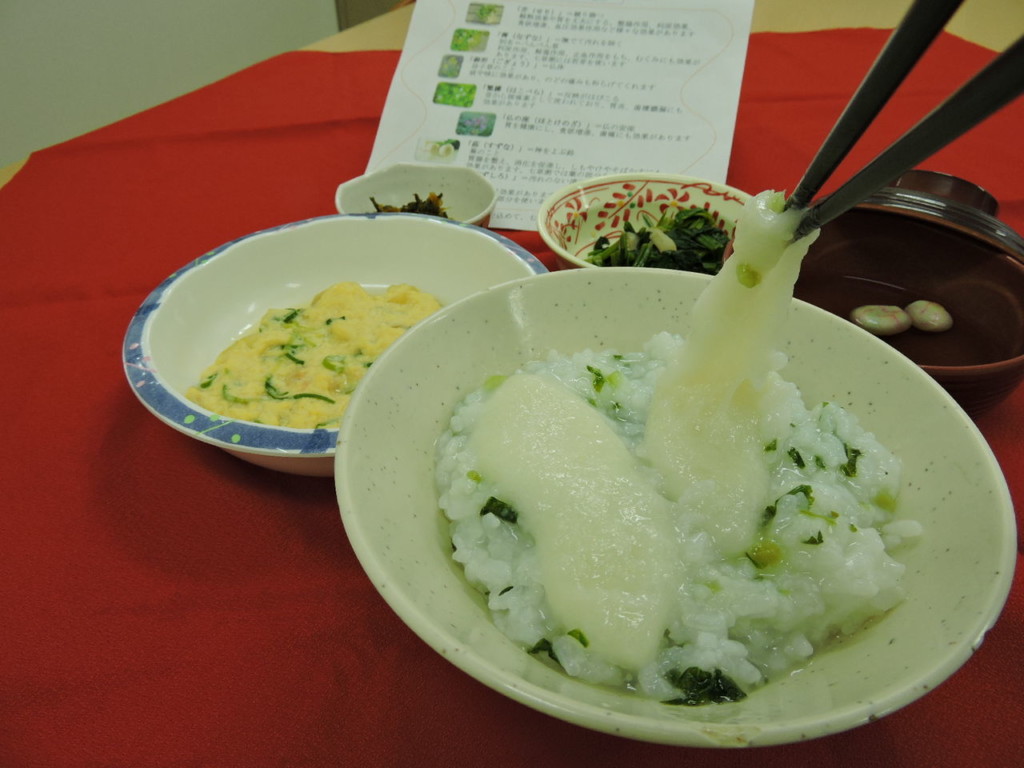 七草の清々しい青みで「無病息災」「健康来福」を願いました。ちょうど良い加減の塩味がたいへん身体に優しく感じられ、美味しいと好評でした。